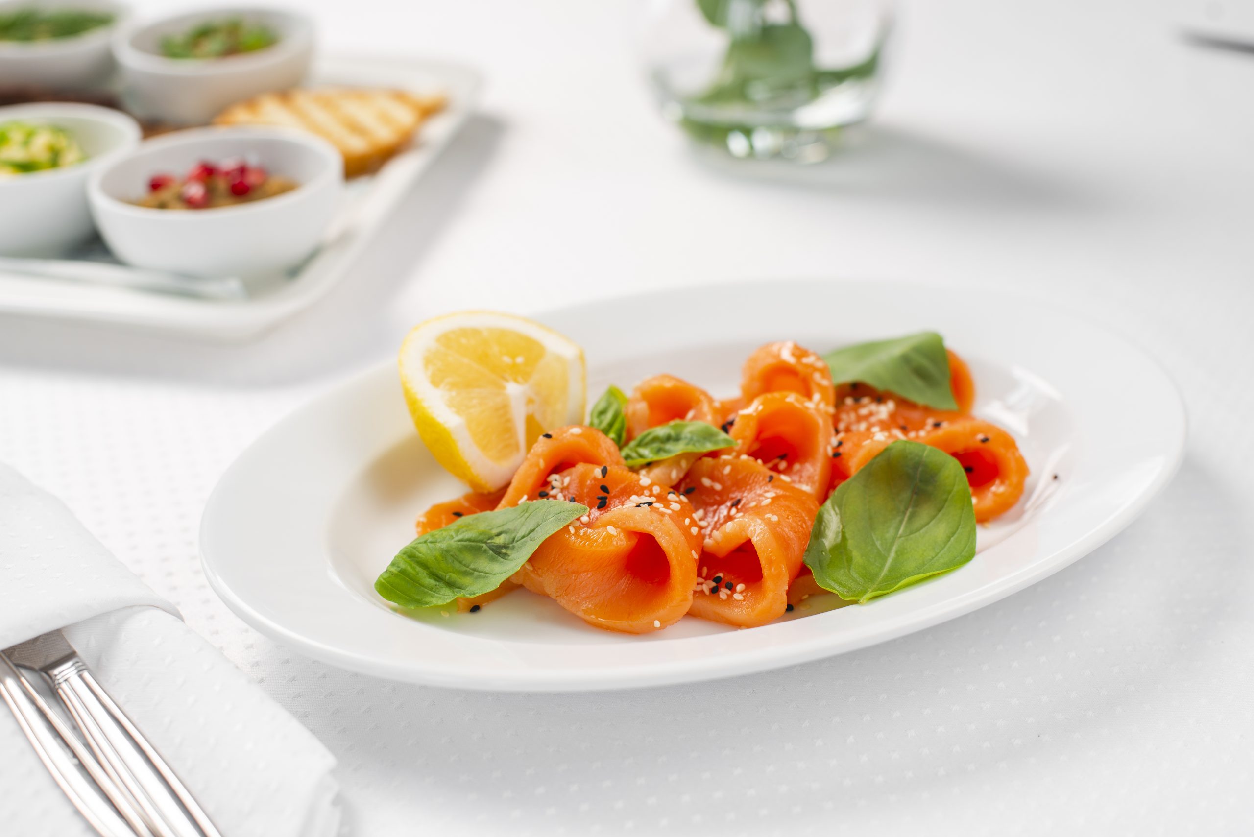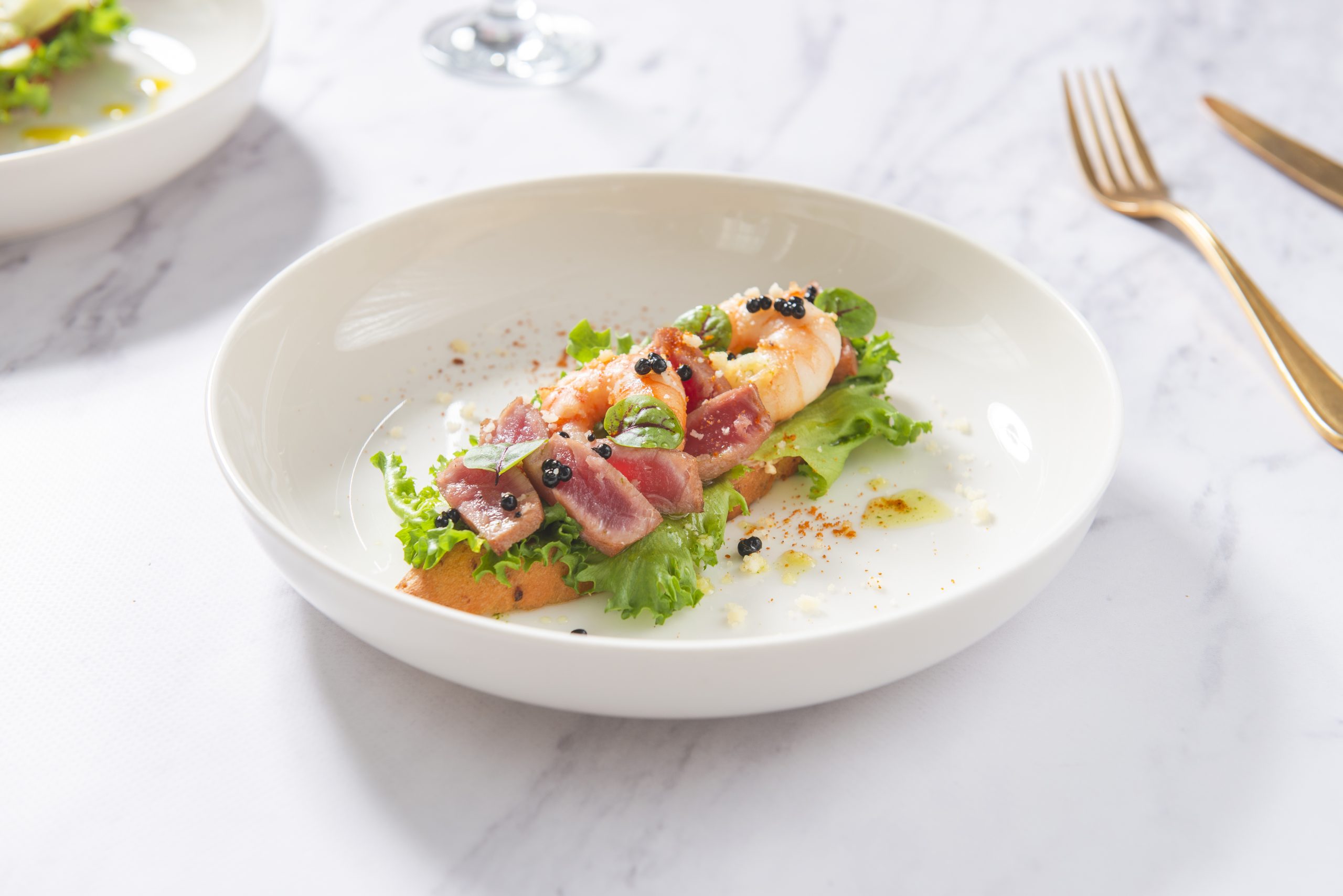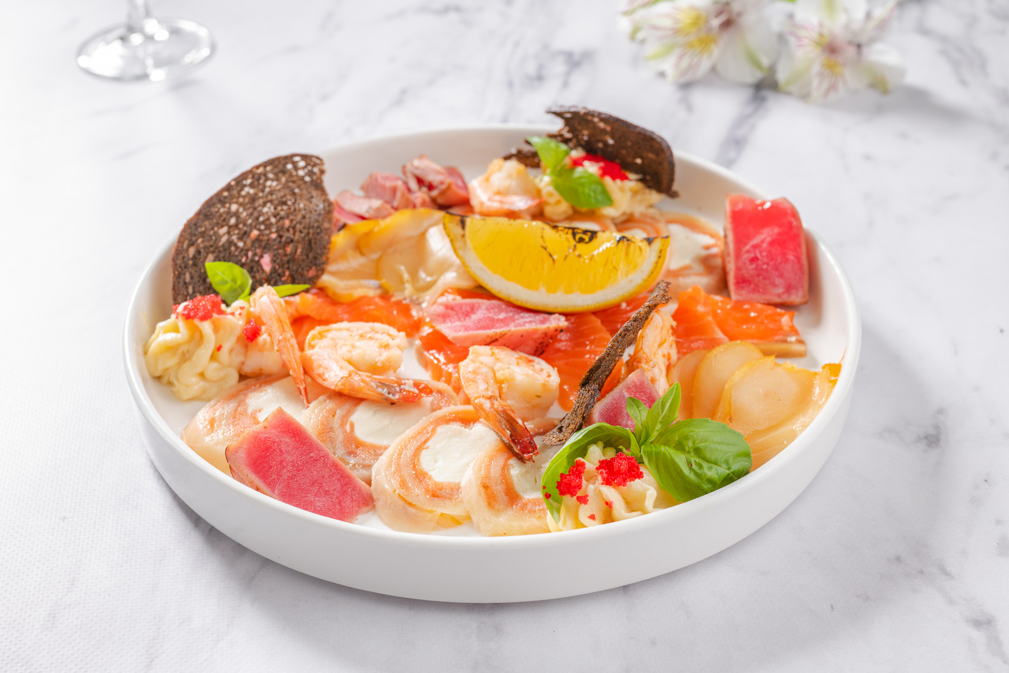 Филе сёмги, тунца и масляной рыбы, обжаренные тигровые креветки, рулетик из масляной рыбы. Украшается бородинскими слайсами, долькой лимона, базиликом и икрой тобико.