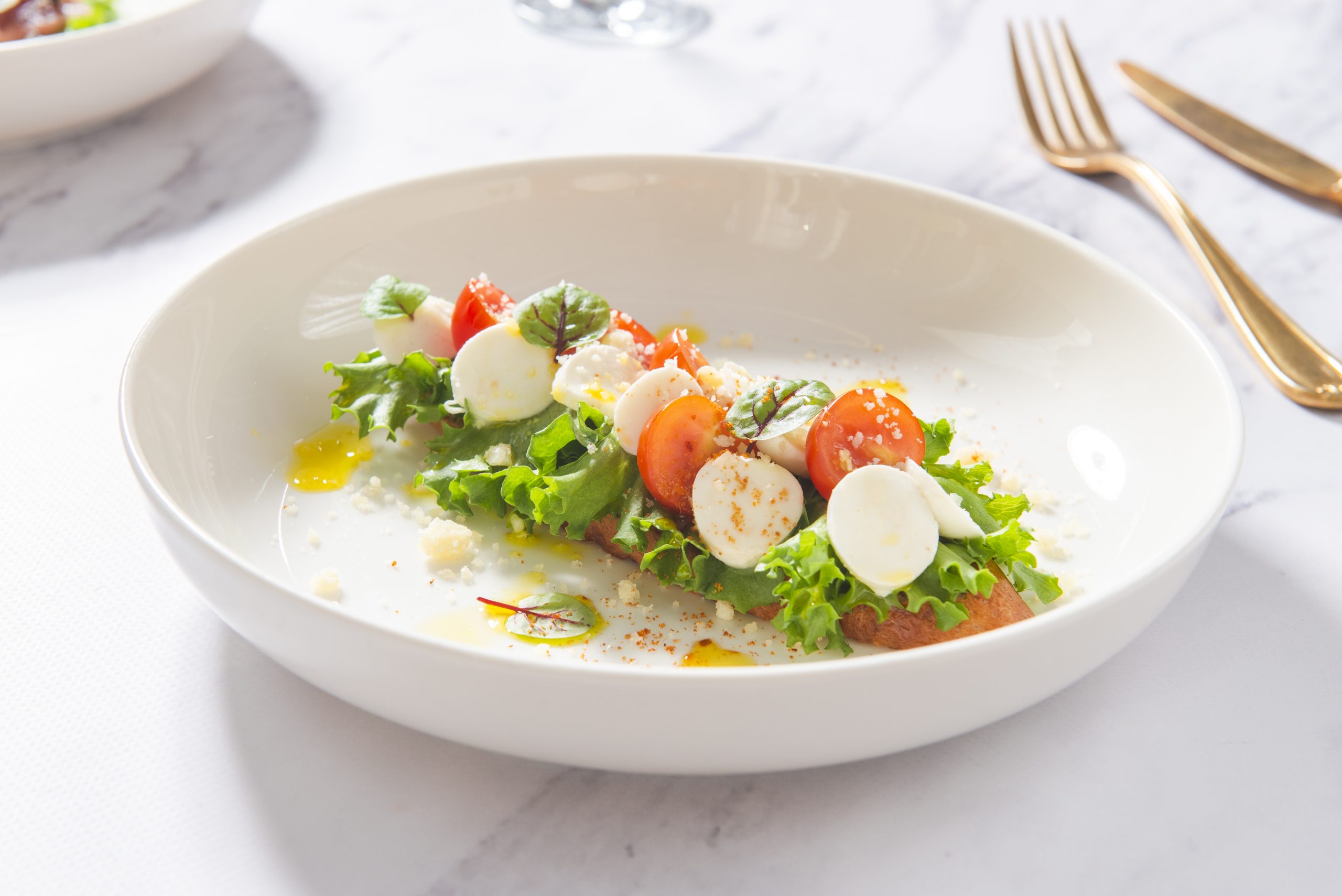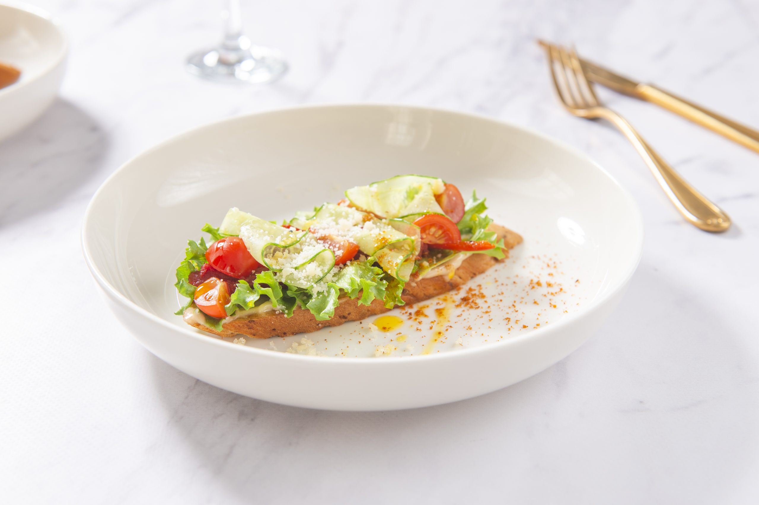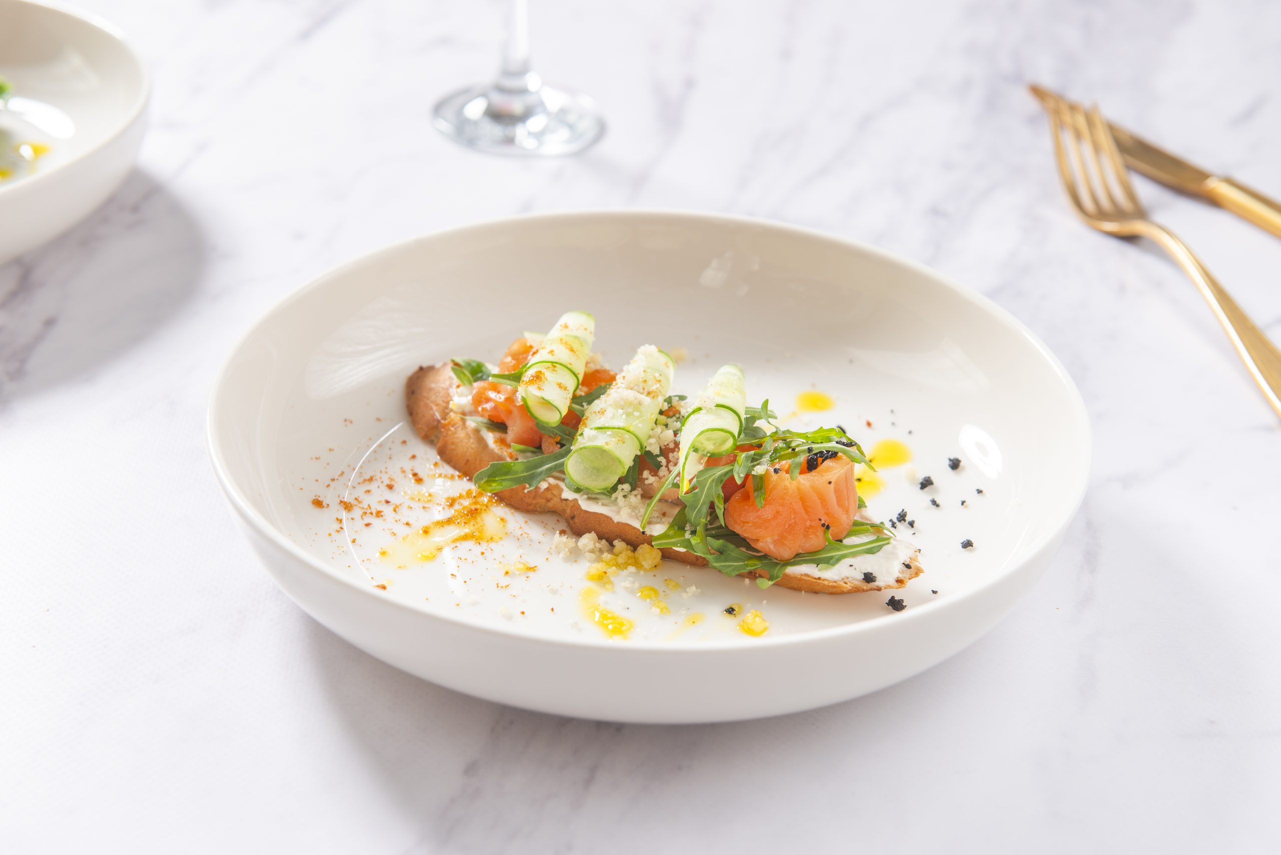 Филе сёмги, тунца и масляной рыбы, обжаренные тигровые креветки, рулетик из масляной рыбы. Украшается бородинскими слайсами, долькой лимона, базиликом и икрой тобико.