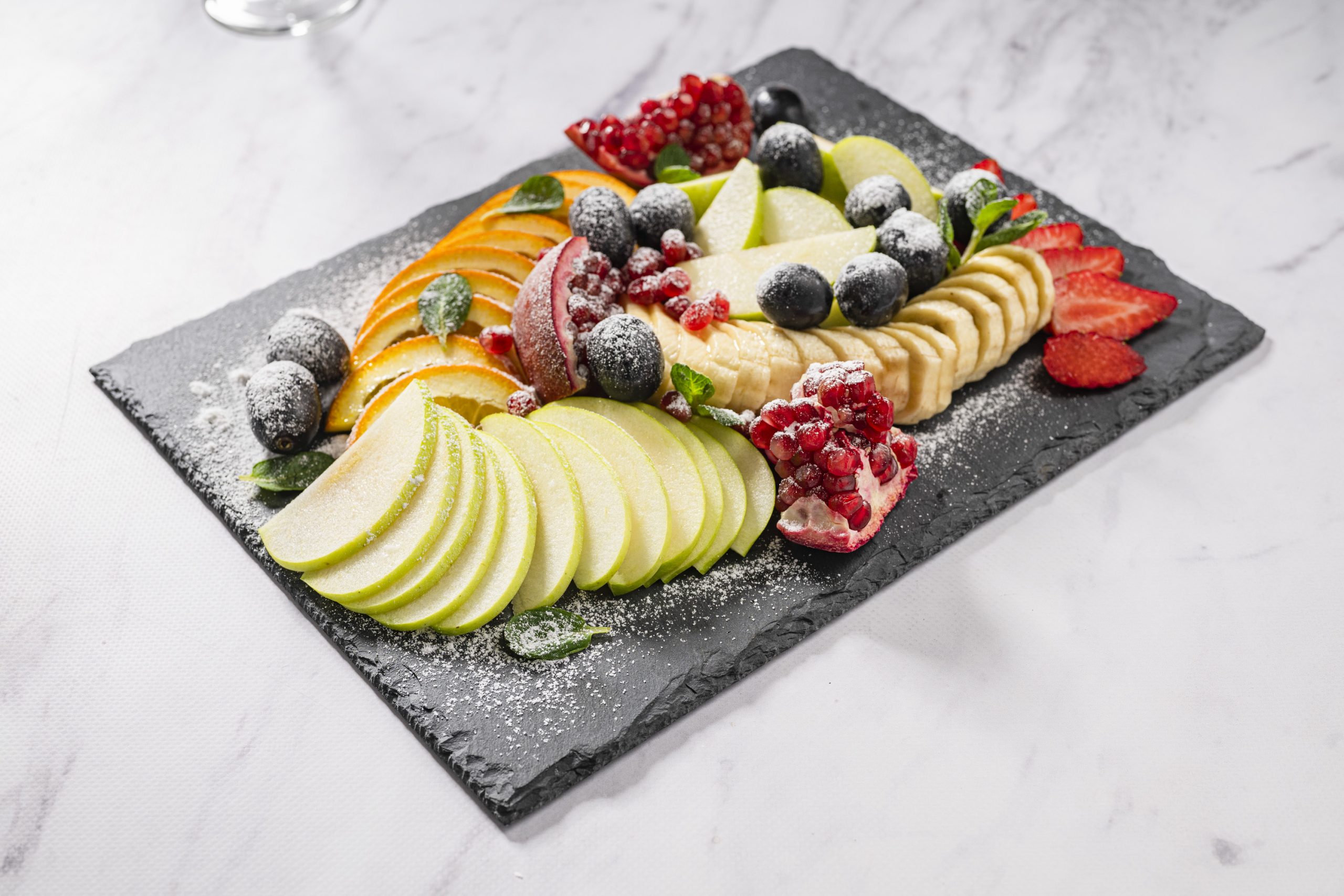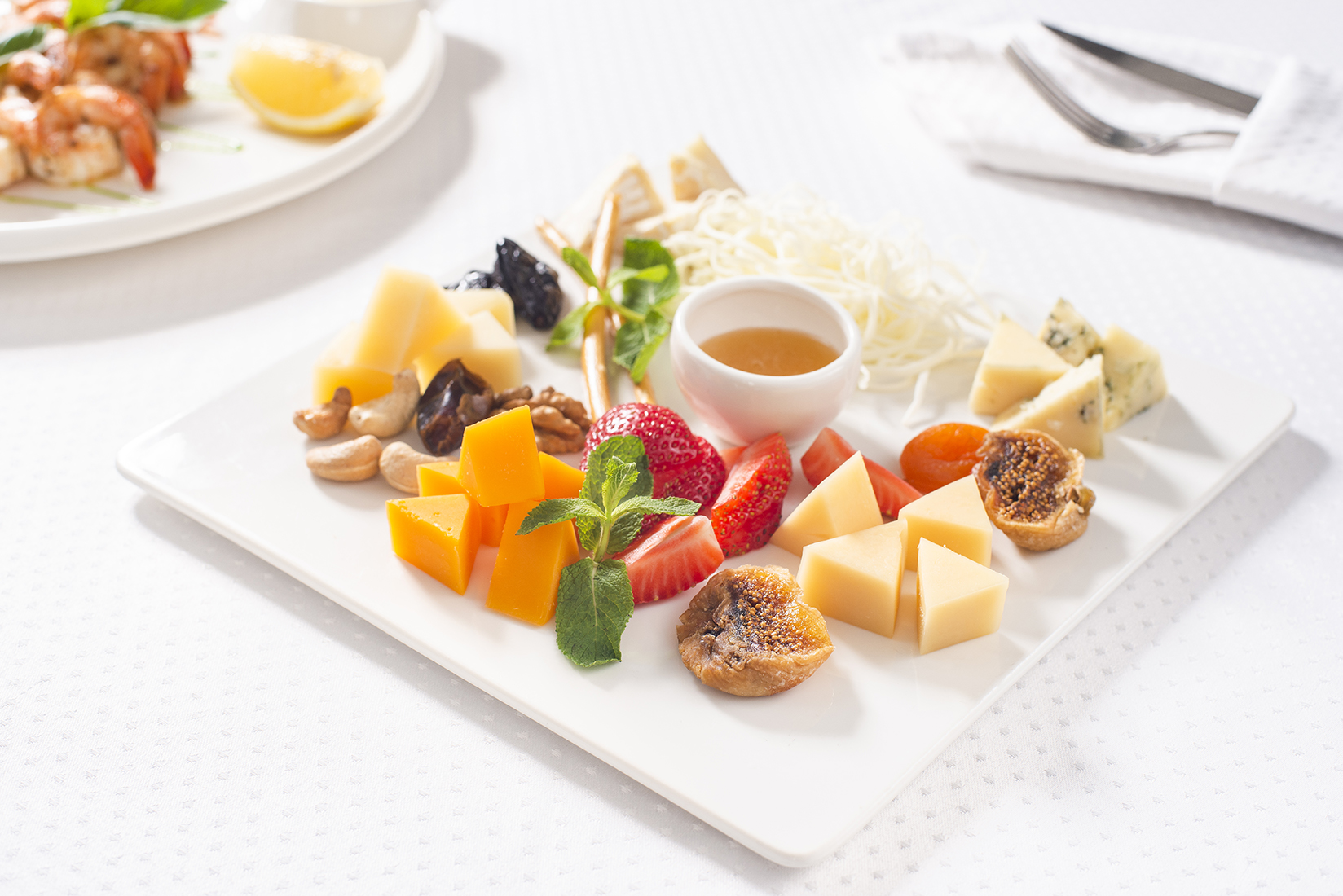 Сыр с изумрудной плесенью, пармезан, моцарелла в рассоле, бастурма из говядины, пармская ветчина, грушевое чатни, клубника, чернослив, финики, маслины, черри, сыр креметте с базиликом, мусс из утки, гриссини, хрустящий багет с луком, фундук, кешью, мёд, мята.