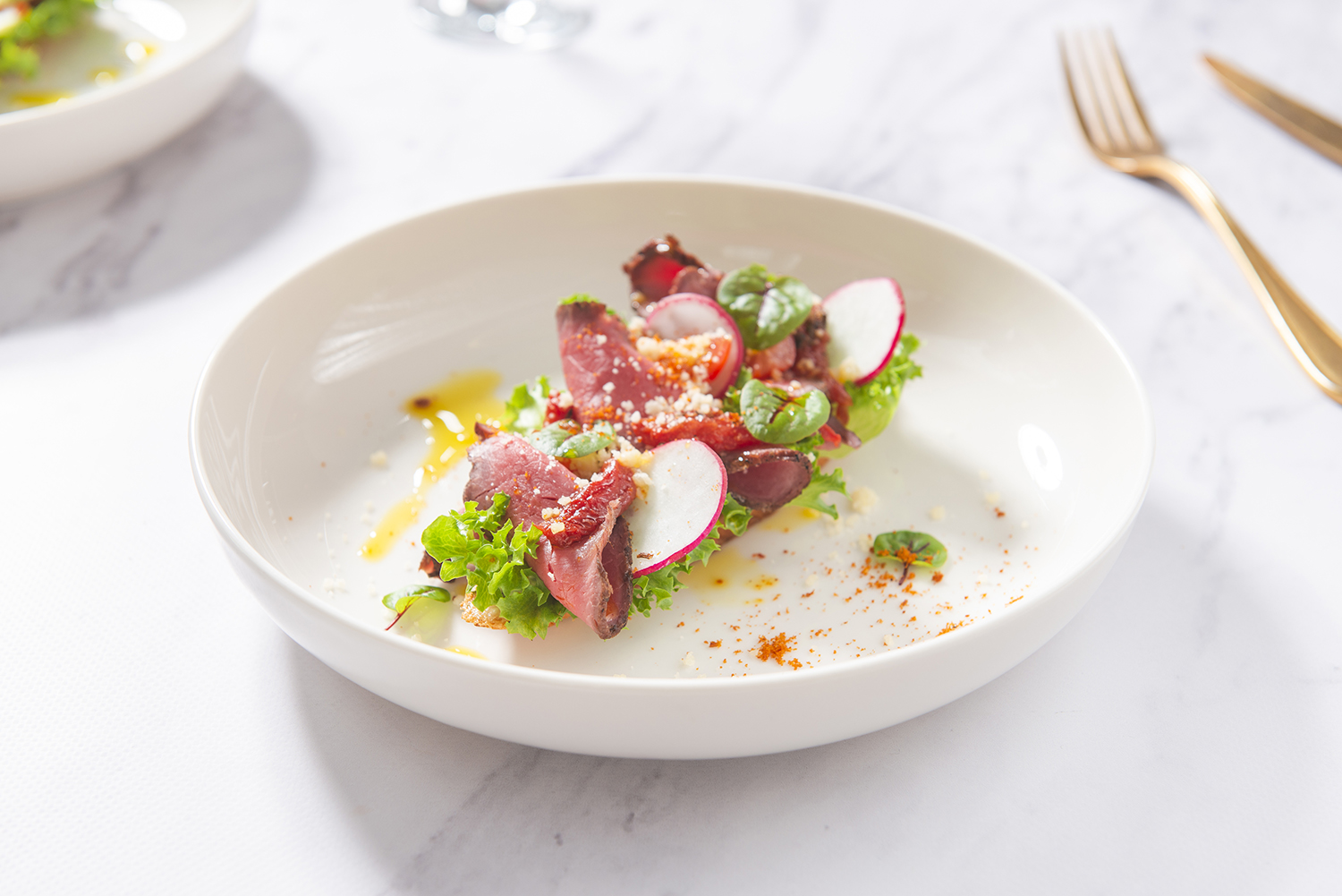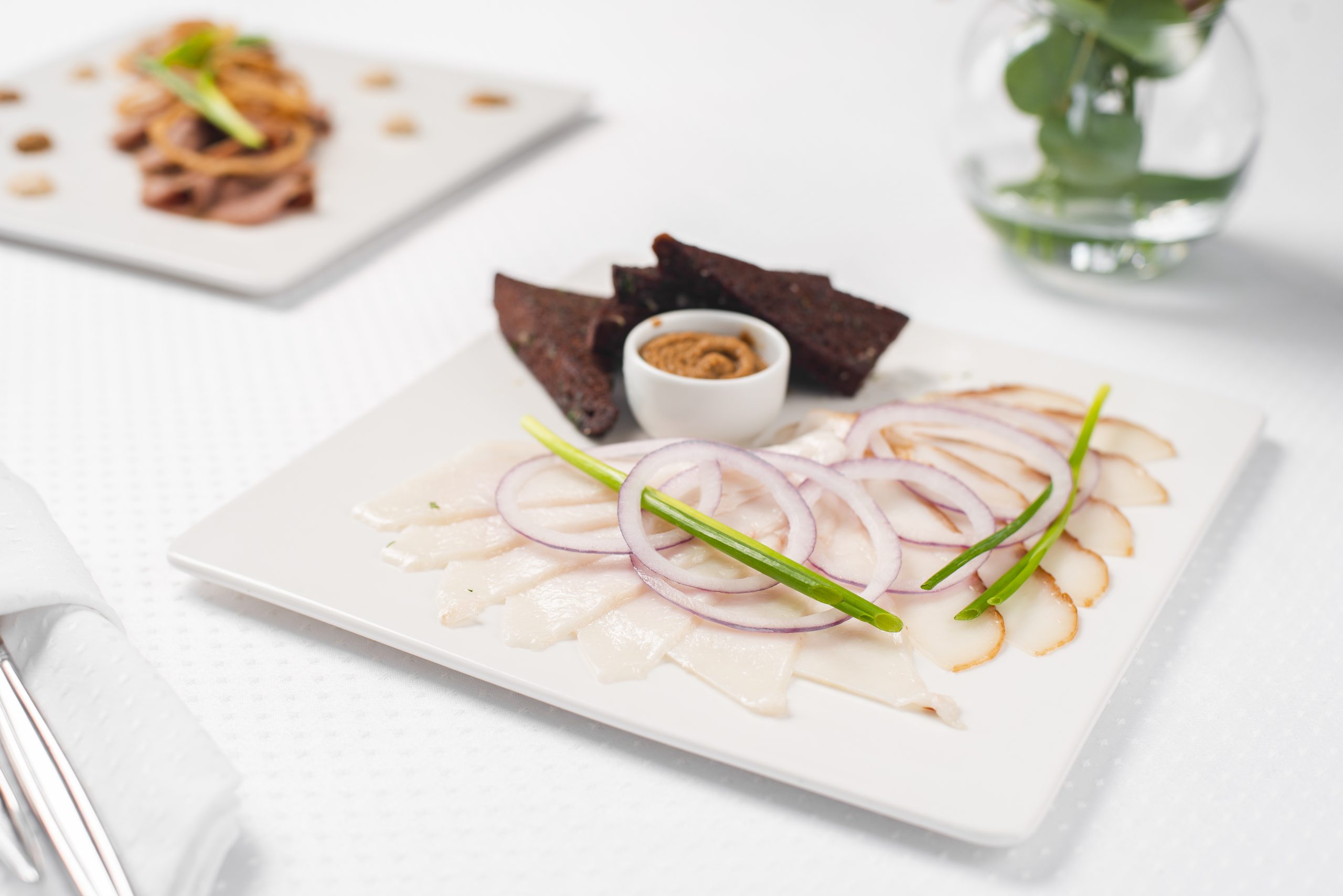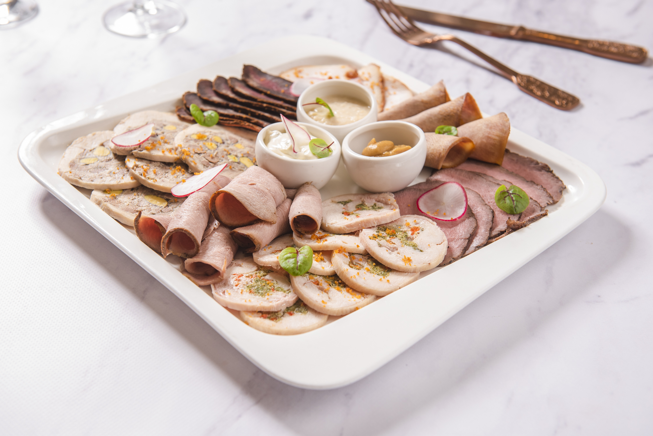 Ростбиф из говядины в пряном маринаде, подкопчённый говяжий язык, бастурма из говядины, копчёная утиная грудка, куриный рулет с омлетом и шпинатом, копчёная куриная грудка, баллотин с куриной печенью и фисташками, соус тар, соус из хрена, микрозелень.