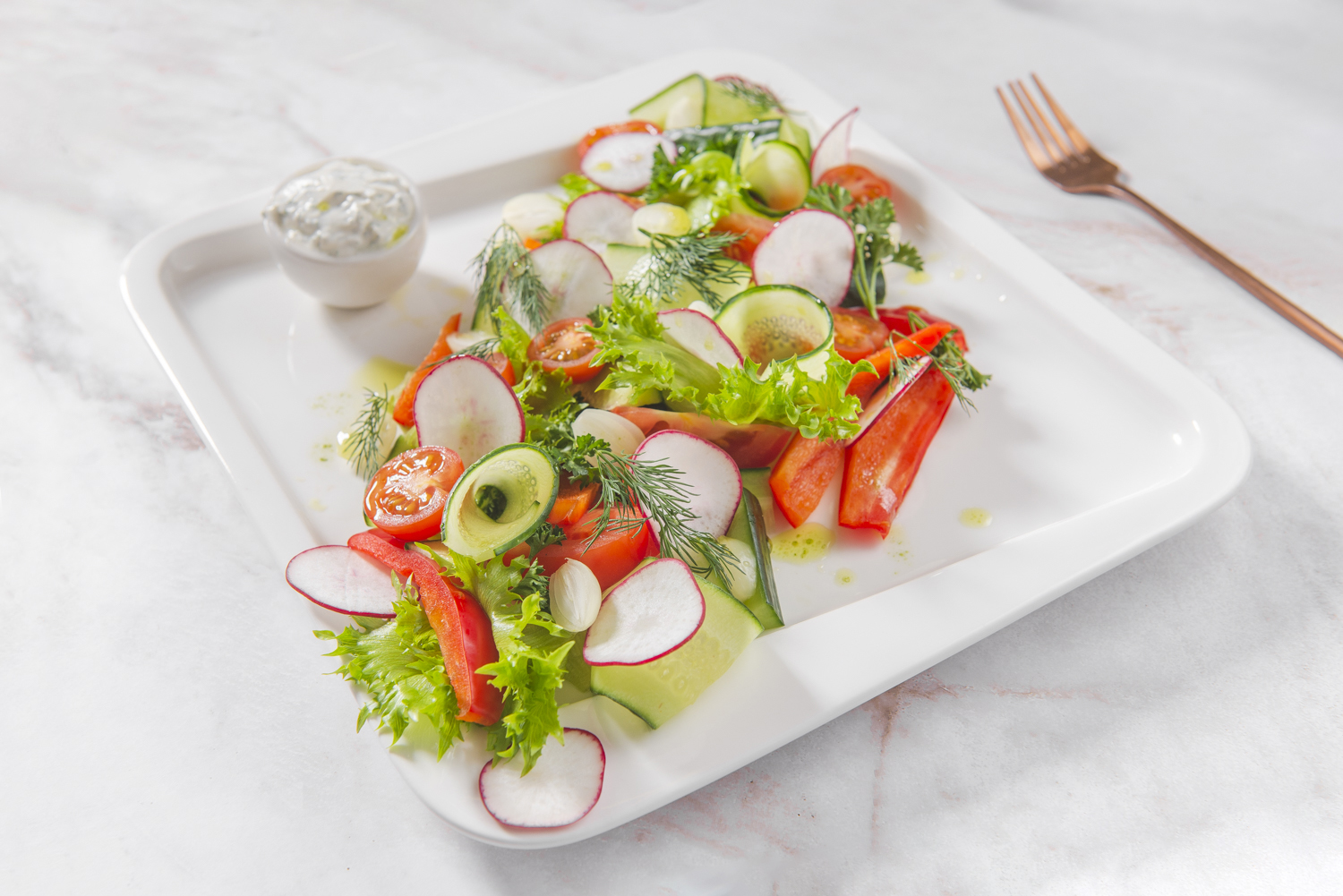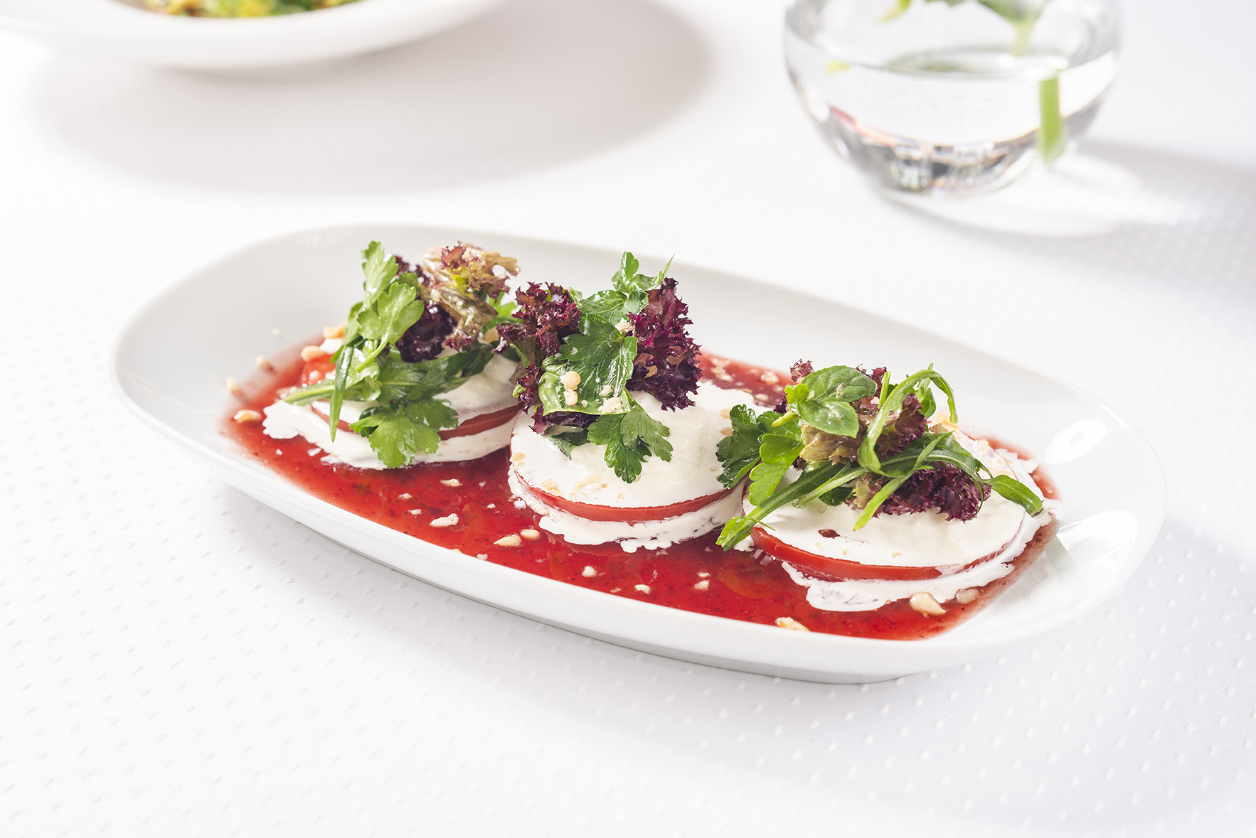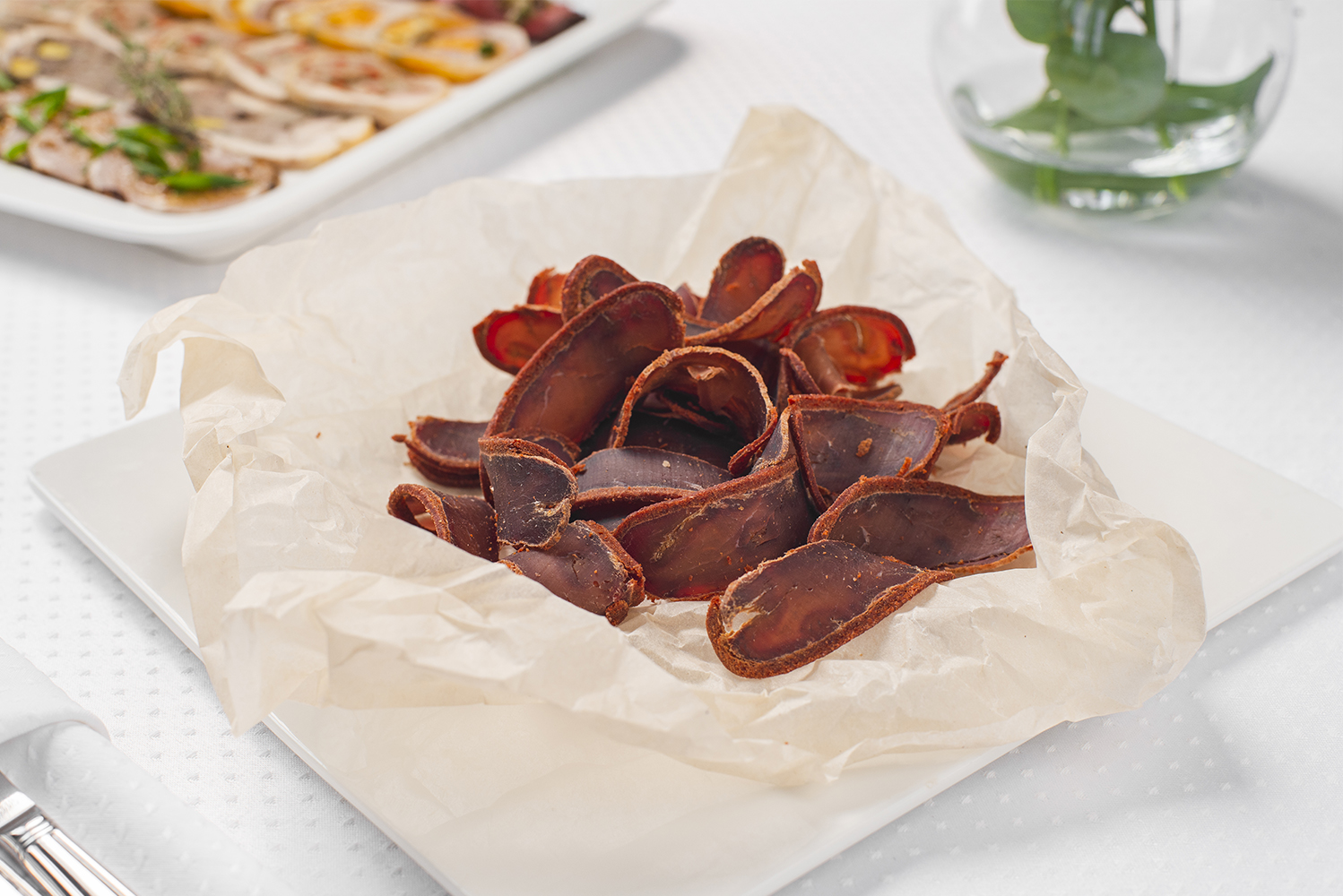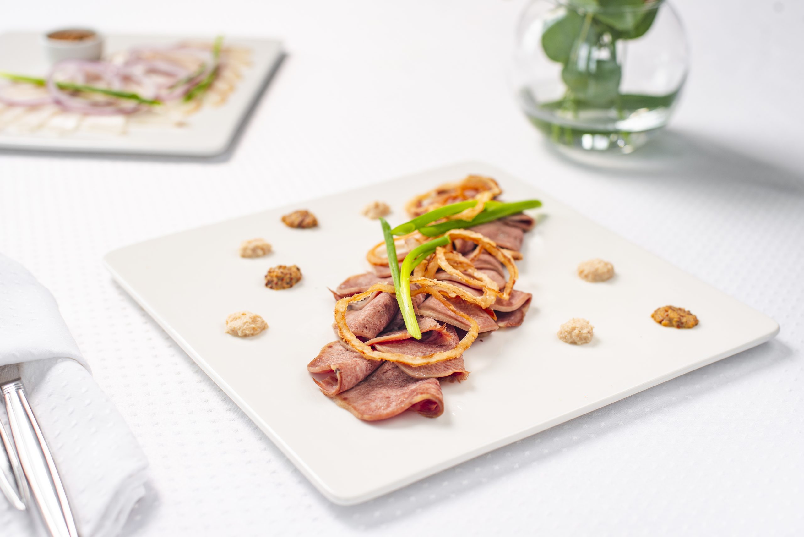 Ростбиф из говядины в пряном маринаде, подкопчённый говяжий язык, бастурма из говядины, копчёная утиная грудка, куриный рулет с омлетом и шпинатом, копчёная куриная грудка, баллотин с куриной печенью и фисташками, соус тар, соус из хрена, микрозелень.